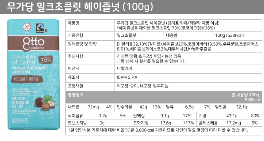 무가당 밀크초콜릿 헤이즐넛 견과류 공정무역 카카오 맛있는 이탈리아 수입 선물용 초콜릿 선물